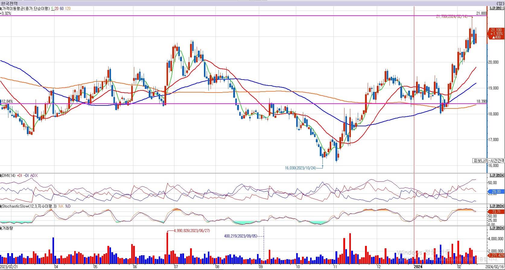 한국전력의 경우 최근의 상승세가 강했습니다. 한국전력은 18,390원에 지지력이 있고, 21,800원의 갭저항을 지금 받고 있습니다. 저항을 받는 모습이 매우 이상적입니다. 이번에 갭저항을 이길 수 있는 모습이라 판단됩니다. 한국전력은 21,800원을 넘어서야 새로운 시세를 시작할 수 있습니다. 다만 현재 이평선과의 괴리가 크기 때문에 신규진입은 당장 하기가 어렵다고 판단됩니다. 다음주 모습을 관찰한 후 매수전략을 설정해 보도록 하겠습니다.