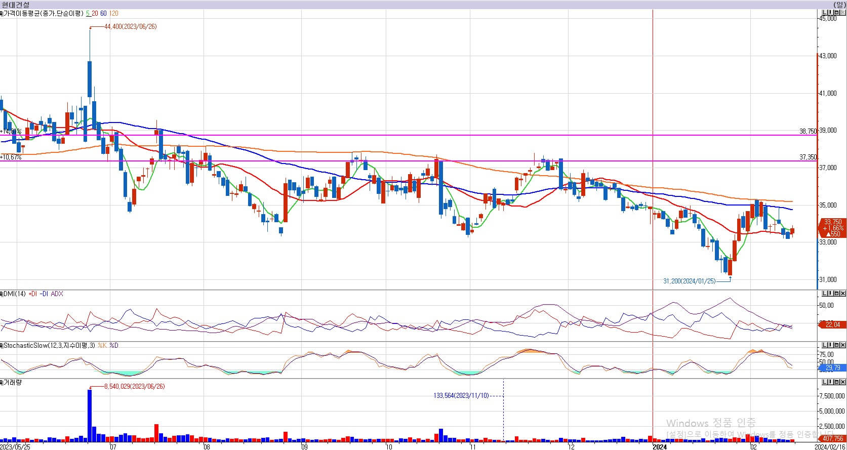 현대건설은 차트가 전체적으로 아직 하락추세를 유지 중이며, 이평선도 모두 역배열을 보여주고 있습니다. 바닥에서 상승은 하지만 아직도 거래량이 적어서 상승 반전에 대한 의지가 약하다고 생각됩니다. 하지만 원자력 건설과 관련된 이슈가 앞으로 많기 때문에 언제 반전을 할지 모릅니다. 그래서 기대감을 가지고 계속 관찰을 해야 합니다. 현대건설의 저항은 37,350원과 38,750원입니다. 다만 지지력은 아래로 존재하지 않습니다. 저항만 있고 지지는 없기 때문에 매수는 할 수 없습니다. 다음 주도 관망하도록 하겠습니다.