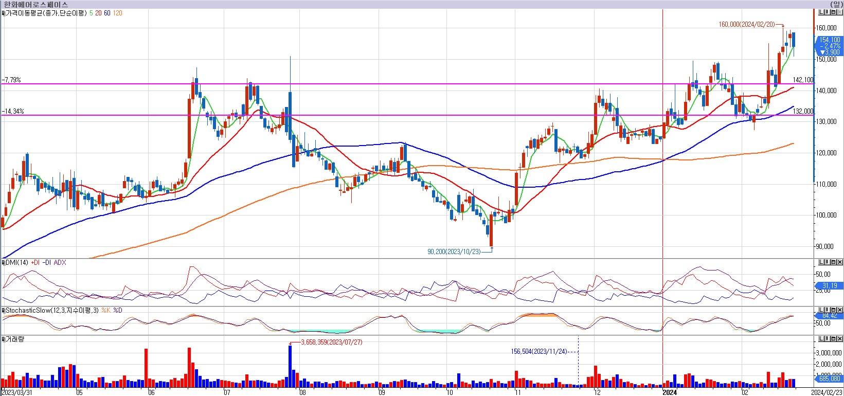 한화에어로스페이스는 145,900원에 저항이 있으며, 129,200원과 124,500원에 지지가 있습니다. 이 중 124,500원은 매우 중요한 지지점입니다. 최근 윗꼬리 양봉에서 145,900원의 저항을 이기고 이틀간 음봉으로 조정을 받았습니다. 이렇게 되면 145,900원은 이제 저항이 없어졌습니다. 즉 다시 상승으로 방향을 튼다면 새로운 가격을 향해 나아갈 확률이 굉장히 높습니다. 1차 지지점이 당장은 멀기 때문에 다음 주는 저는 관망하도록 하겠습니다. 추세가 살아있는 차트는 잘 꺾이지 않으므로 천천히 매수전략을 세워보도록 하겠습니다.