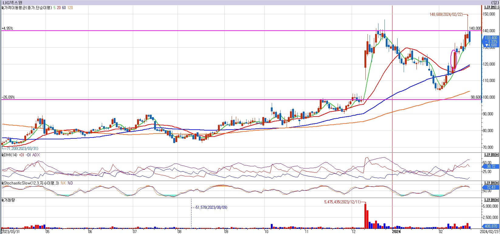 LIG넥스원의 경우 98,600원의 갭지지가 있고, 140,000원에 저항이 있습니다. 최근 2월 14일 양봉에서 거래량이 터졌습니다. 그 양봉에서 중요한 저항을 이겨내야 했기에, 거래가 터진 것이며 LIG넥스원은 이 양봉으로 큰 저항을 이겨냈으므로, 상승에 대한 힘을 크게 얻었습니다. 모든 것을 다 깼다가 다시 올라가는 것이기 때문에 14만 원 저항은 이번에 가볍게 넘을 수 있는 힘을 가지고 있습니다. 저는 119,000원이 오면 LIG넥스원을 매수하도록 하겠습니다. 오지 않고 위로 가버린다면 다음 매수기회를 노려보도록 하겠습니다.