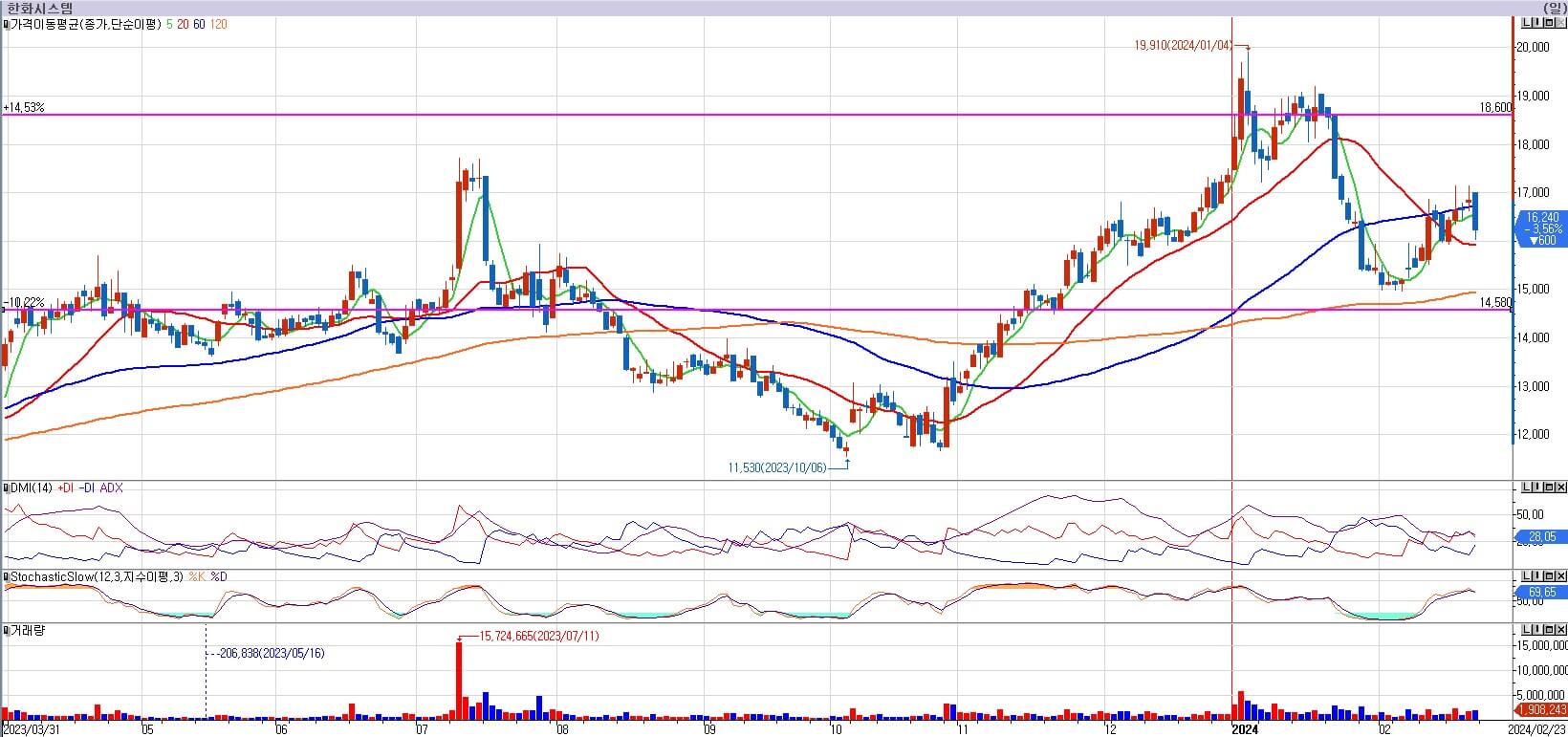 한화시스템은 이번주 상승을 하다가 23일 음봉을 맞았습니다. 18,600원의 저항과 14,580원의 지지 사이에서의 이런 움직임은 사실 큰 의미는 없습니다. 23일의 음봉도 언제라도 돌려세울 수 있는 모습이고, 아니면 연속 음봉을 맞고 다시 떨어져도 이상하지 않는 차트입니다. 즉 다른 종목보다는 차트가 약한 것도 사실입니다. 한화시스템은 관망하도록 하겠습니다.