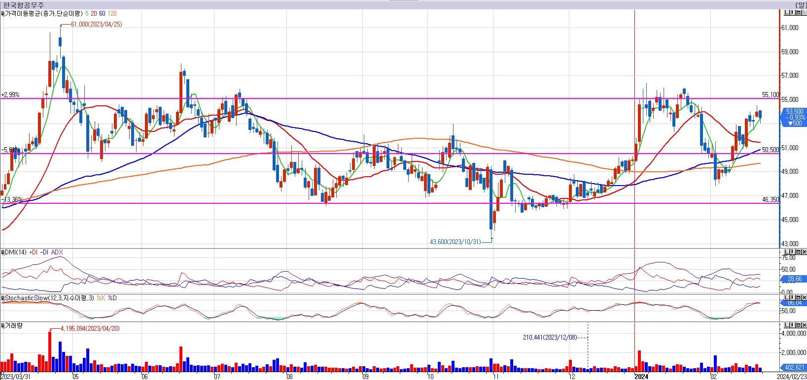 한국항공우주는 위의 강력한 저항인 55,100원을 아직은 돌파하지 못했습니다. 다행히 상방으로 방향을 튼듯한 모습입니다. 한국항공우주는 55,100원 저항이 바로 앞이기 때문에 지금 매수는 불가합니다. 적어도 저항을 돌파하고 난 뒤 매수 전략을 설정하는 것이 맞다고 생각합니다. 다음주 55,100원 돌파여부를 관찰하도록 하겠습니다. 60,000원에도 저항이 있지만 우선 55,100원 돌파가 우선입니다.