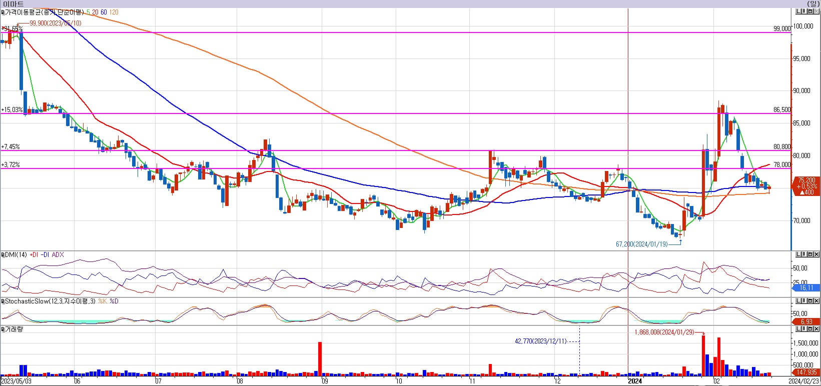 이마트는 2월 13일 80,900원에 매수를 하였습니다. 이마트는 72,600원을 이탈하지 않는다면 보유하도록 하겠습니다. 이마트는 아래에 이평선과 지지력이 풍부하기 때문에 걱정은 되지 않습니다. 최근의 음봉도 저항으로 작용하지 않기 때문에 문제 될 것은 없다는 생각입니다. 다음 주 모습을 관찰하도록 하겠습니다.