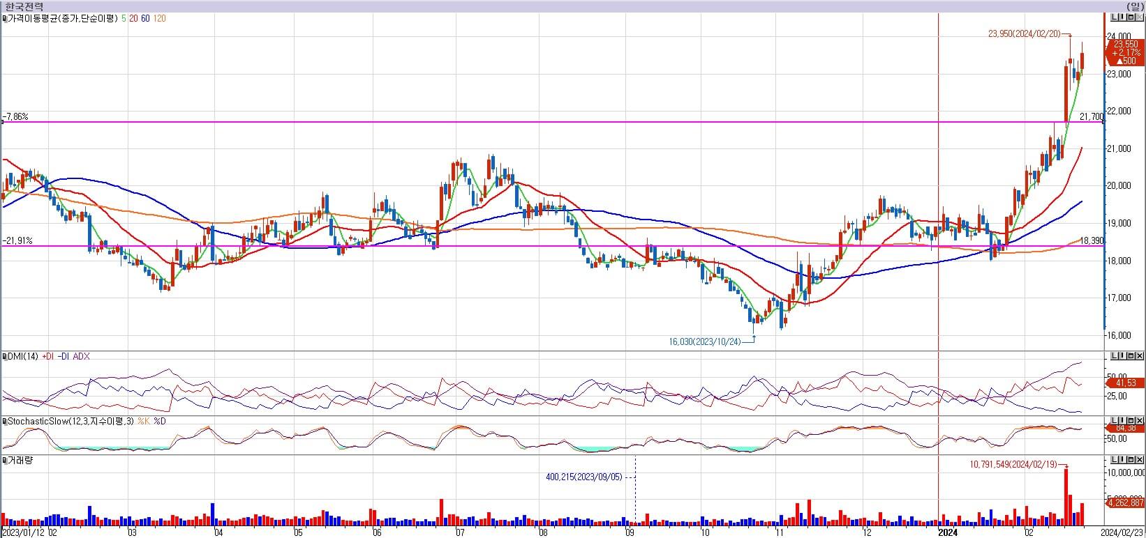 한국전력의 주가가 나날이 상승하고 있습니다. 원전때문이 아니라 전기요금 상승과 경영 정상화로 인해 저평가 이슈가 부각되었기 때문입니다. 결국 한국전력은 21,800원의 저항을 강한 갭양봉으로 뚫었고, 계속 상승하는 모양을 보이고 있습니다. 이젠 21,700원의 갭지지가 생성되어 지지력을 확보했습니다. 여기서 한국전력이 얼마나 갈지 아무도 모릅니다. 다만 이평선과의 괴리가 크기 때문에 매수는 불가합니다. 다음 주 관찰하도록 하겠습니다.