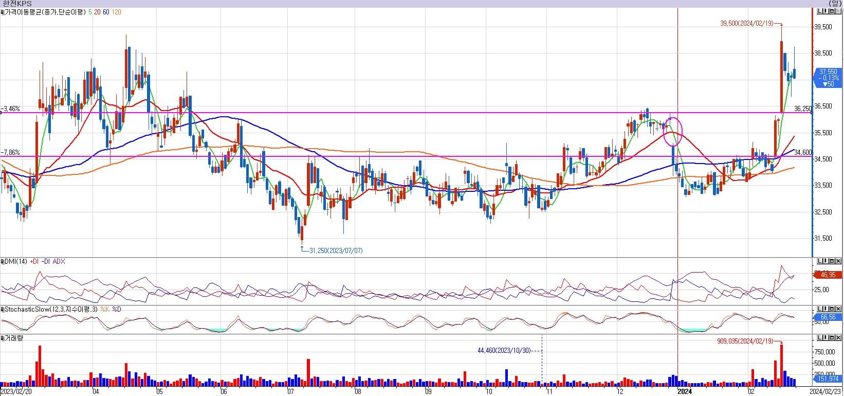 한전 KPS는 정부의 밸류업 프로그램 관련 저평가 이슈로 급등했습니다. 원전과 관련하여 급등한 것이 아니지만, 37,600원의 저항을 한방에 뚫어버렸습니다. 공기업이 이런 상승을 하는 것도 흔치 않은 일입니다. 한전 KPS는 36,250원이 중요한 지지점으로 작용을 합니다. 현재 4일간 음봉을 맞았으나, 이 정도 거래량으로는 나쁘다 좋다를 판단하기 힘든 단계입니다. 다음 주 추가적으로 조정이 온다면 36,250원 지지여부를 보겠습니다.