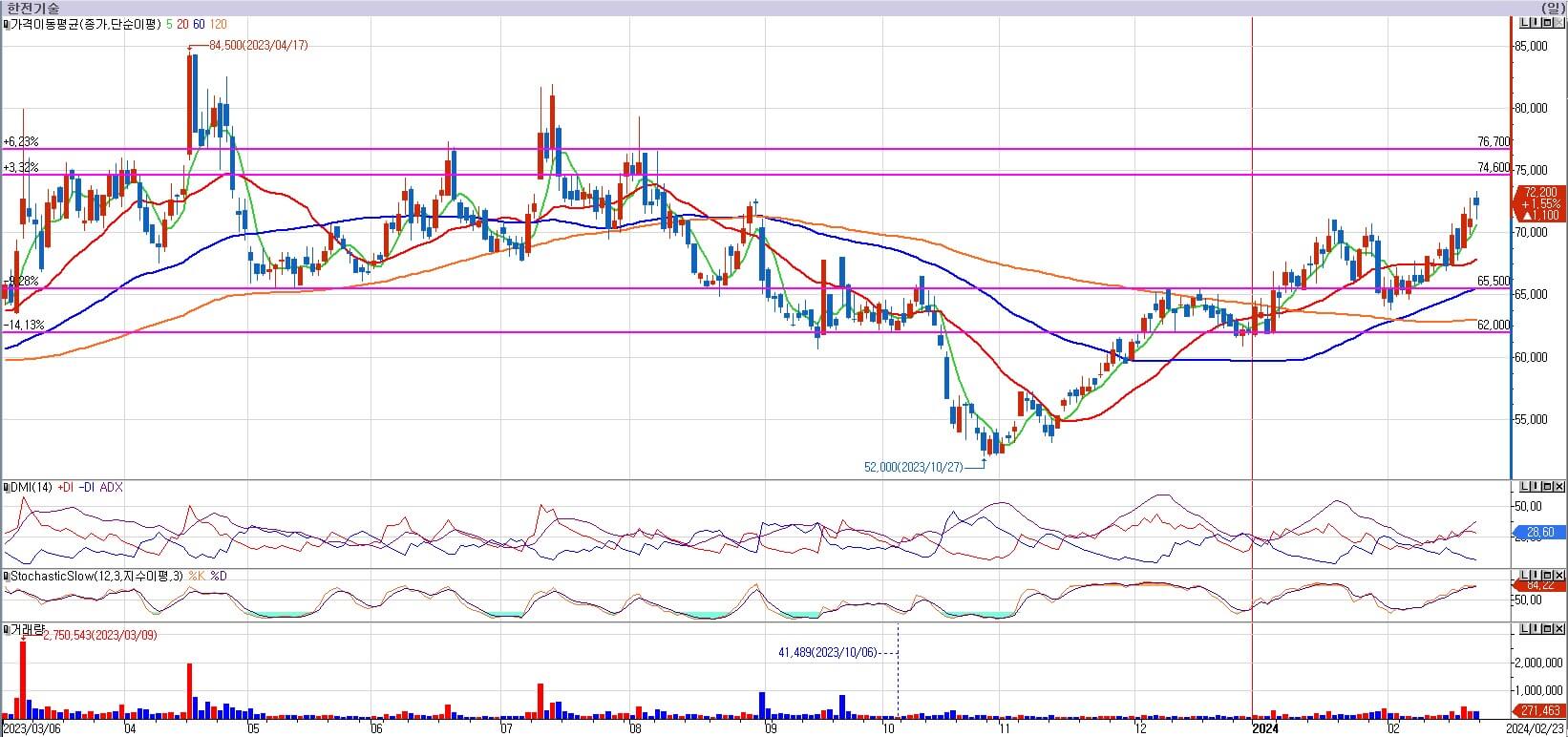한전기술의 경우 72,400원과 74,600원에 저항이 있습니다. 그리고 지지는 62,000원에 있습니다. 한전기술 역시 이평선이 정배열로 바뀌고 있고, 전체적으로 차트가 다시 살아나는 모양새를 보여주고 있습니다. 위의 저항 2개를 모두 이겨내야만 상승에 대한 확신을 가질 수 있지만, 저항에 흔들리며 조정을 줄 때 매수할 기회를 잡을 수 있을 것이라 판단합니다. 현재 지지력은 62,000원으로 멀기 때문에 확실한 모습이 나올 때까지는 관망하도록 하겠습니다.