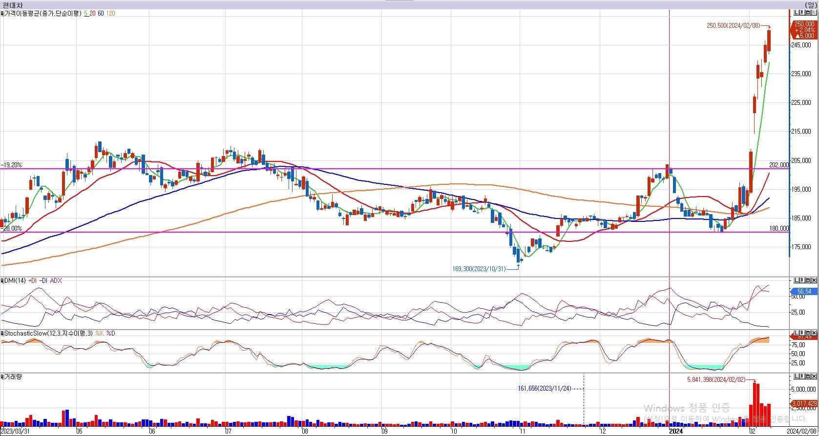 현대차는 이틀간 6%와 9%대 상승을 주었습니다. 밸류업 이슈로 모든 저항을 한 번에 돌파를 해 버리고 날아갔습니다. 현재 이평선과의 갭이 너무 크고, 갭 상승이 엄청났기에 지금 매수할 수는 없습니다. 저는 현대차를 적어도 202,000원까지는 기다릴 생각입니다. 2월 2일 갭상승에 거래량이 제법 터졌습니다. 만약 여기서 더 상승한다면 거래량이 감소하는 것을 확인해야만 합니다. 아니면 천천히 조정을 받을 가능성도 높다고 생각 듭니다. 조정 시 매수타이밍을 추후 잡아보겠습니다.