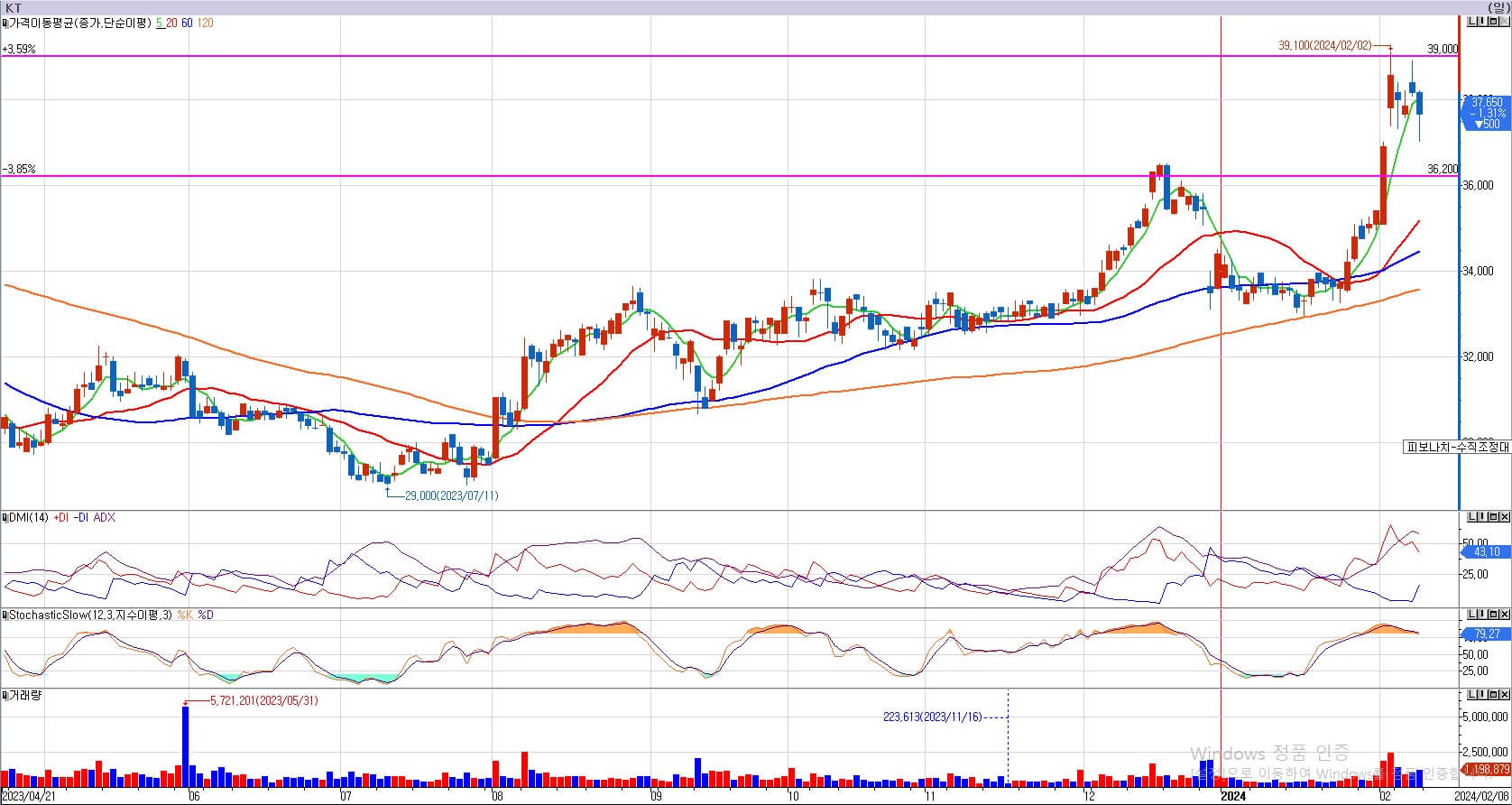 통신주 역시 이번 기업 밸류업 프로그램의 대표 기대주로 각광받고 있습니다. KT는 39,000원 부근의 저항이 있었는데, 벌써 그 부분까지 주가가 올라온 모습입니다. 여기서 39,000원을 넘을지 아니면 조정을 받을지는 모릅니다. 아직은 판단할 수 없고, 적당한 조정이 온다면 매수 전략을 수립해 보도록 하겠습니다. 36,200원에는 지지력이 있습니다.