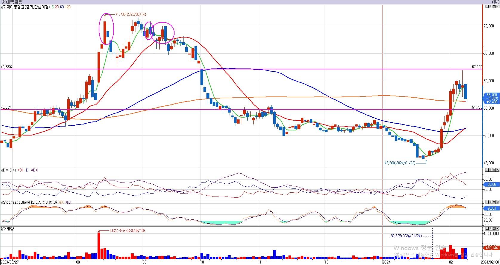 현대백화점은 이번주 62,100원의 저항을 맞고, 오늘 -4%의 하락을 했습니다. 지난주와 마찬가지로 54,700원에서는 현대백화점을 매수하는 전략을 유지하겠습니다. 그리고 53,700원을 이탈하면 손절하도록 하겠습니다. 다음 주 매수가 되기를 바라보고, 그 이후를 확인하도록 하겠습니다.
