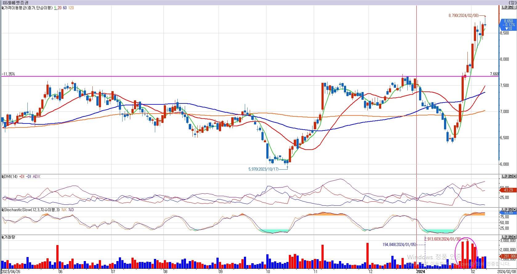 미래에셋증권의 경우 8,080원의 저항을 돌파하고 계속 상승 중에 있습니다. 미래에셋은 9,000원까지는 매물이 많아 저항을 겪을 수밖에 없습니다. 밑의 거래량을 보면 거래가 하루 걸러 계속 터지는데, 이것은 매물을 흡수하기 위한 거래량이며 이런 현상은 충분히 받아들일 수 있는 거래량입니다. 미래에셋 역시 급격한 상승으로 이제야 이평선이 정배열로 서서히 돌고 있어, 신규매수는 불가합니다. 적어도 7,600원까지는 기다리도록 하겠습니다.