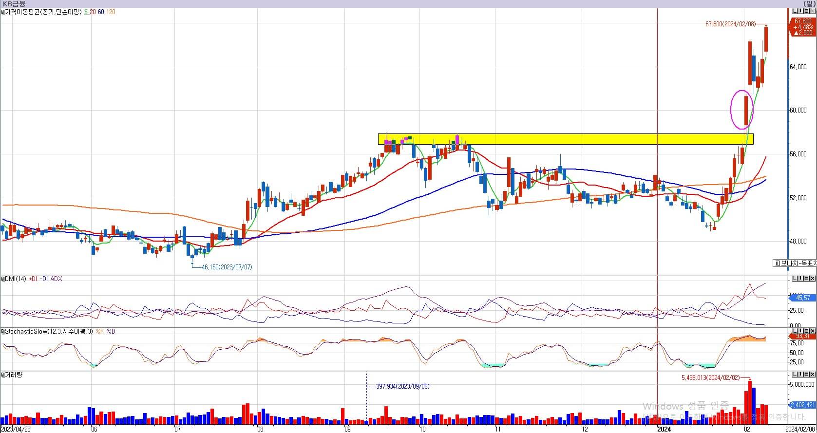 KB금융의 경우 역시도 하루하루 급등을 주고 있습니다. KB금융은 57,000원대의 전고점 영역을 2월 1일 갭상승으로 돌파했습니다. 2월 1일 시작가가 전고점을 넘어서 시작했기 때문에, 정말 강하다고 생각할 수도 있지만, 저는 이런 모습을 싫어합니다. 주가가 강하게 가려면 전고점의 개인들 물량조차 흡수해서 가야 크게 갈 수 있습니다. 하지만 KB금융은 전고점의 매물을 받지 않고 상승을 해 버렸습니다. 물론 KB금융 역시 69,000원까지는 저항이 이어져 있기 때문에, 이런 해석은 큰 의미가 없기도 합니다. 앞으로 관찰해 보도록 하겠습니다.