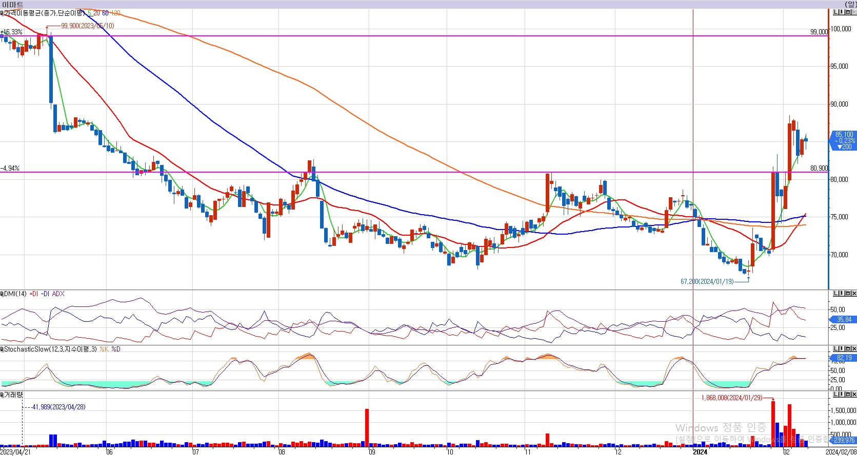 이마트는 80,900원의 매수기회를 이번주 주지 않았습니다. 전략은 다음 주까지 유지하도록 하겠습니다. 80,900원이 오면 매수를 하겠습니다. 거래량을 보면 전혀 문제 될 것이 없는 차트입니다. 다음 주에는 매수기회를 주길 바라겠습니다.