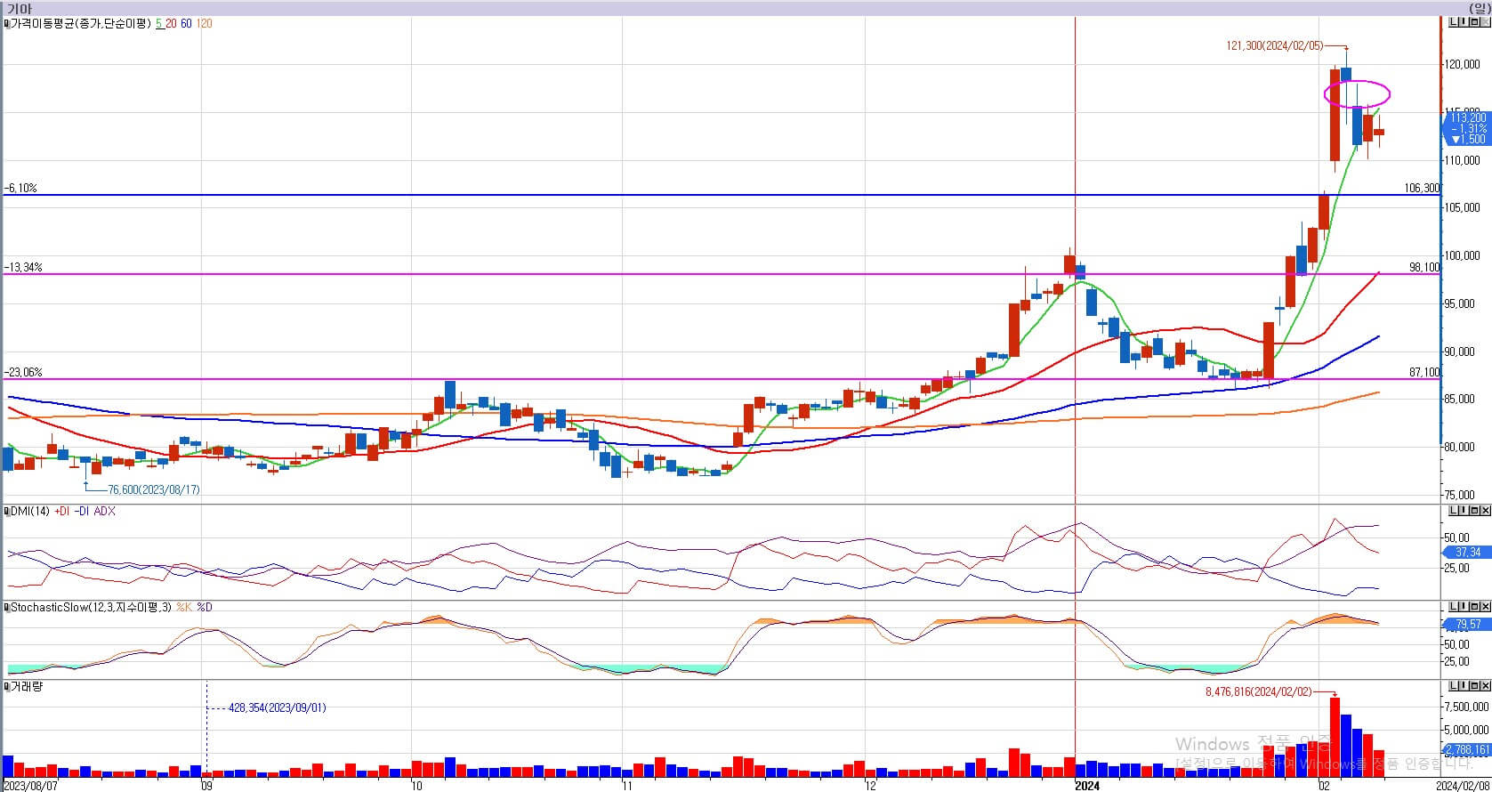 기아의 경우 98,100원의 저항을 돌파할 때조차 거래량이 그렇게 크지는 않았습니다. 이런 경우는 전고점에서의 매물이 크지 않았다는 것을 의미합니다. 기아 역시 2월 2일 12% 갭상승에 거래량이 가장 많이 터졌습니다. 이평선과의 갭이 너무 크기 때문에, 지금 신규매수할 수는 없습니다. 기아는 101,000원까지는 충분히 기다린 이후 매수전략을 수립하도록 하겠습니다.