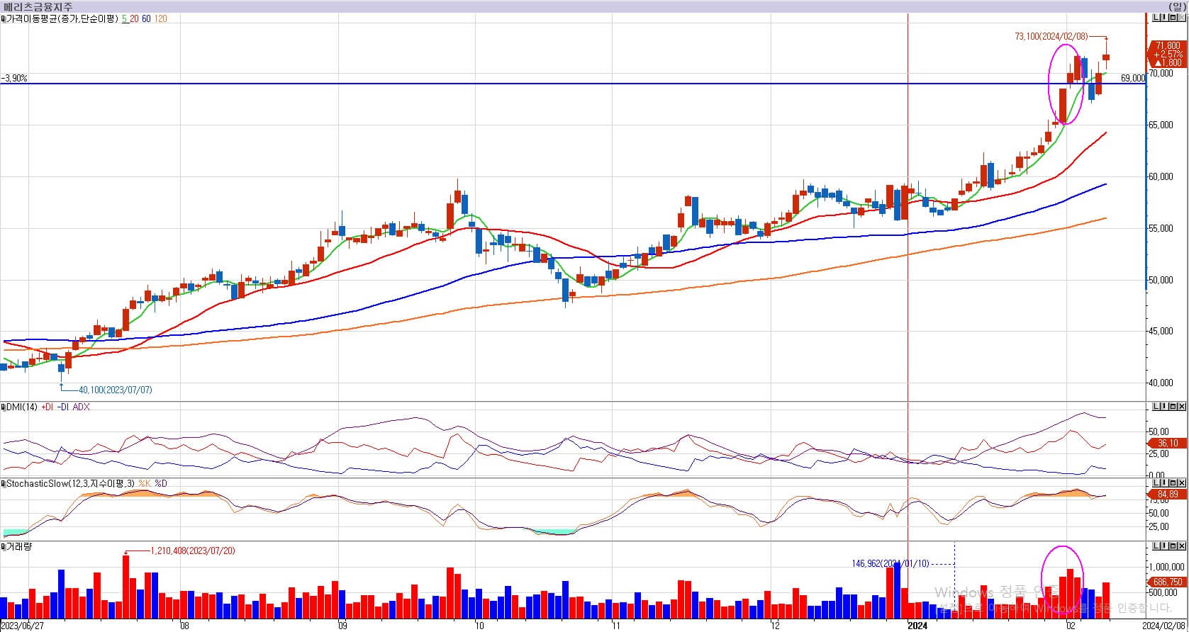 메리츠금융지주의 경우 1월 18일부터 상승의 각도가 가팔라지기 시작했습니다. 상승의 각도가 가팔라진다는 것은 강한 매수세가 들어왔다는 것을 의미합니다. 정부 발표는 1월 25일이었지만, 그전에 종목들이 흔적을 남기는 것을 보고 있으면, 역시 한국시장이라는 생각이 듭니다. 메리츠금융지주는 현재 상승을 하고 있지만, 최근 거래량이 좀 상대적으로 높습니다. 메리츠는 다른 주식과 다르게 신고가이기 때문에 매물이 없습니다. 매물이 없는 곳에서는 거래가 터지는 것은 다른 의도가 있을 수도 있으므로, 주의해야 합니다. 다음 주 지켜보도록 하겠습니다.