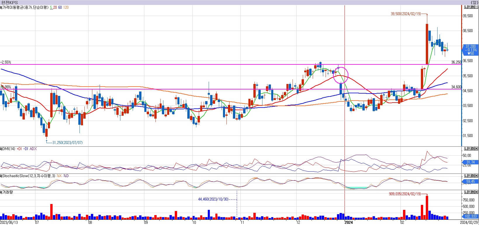 한전 KPS는 정부의 밸류업 프로그램 관련 저평가 이슈로 급등했습니다. 원전과 관련하여 급등한 것이 아니지만, 37,600원의 저항을 한방에 뚫어버렸습니다. 공기업이 이런 상승을 하는 것도 흔치 않은 일입니다. 한전 KPS는 36,250원이 중요한 지지점으로 작용을 합니다. 현재 4일간 음봉을 맞았으나, 이 정도 거래량으로는 나쁘다 좋다를 판단하기 힘든 단계입니다. 다음 주 추가적으로 조정이 온다면 36,250원 지지여부를 보겠습니다.