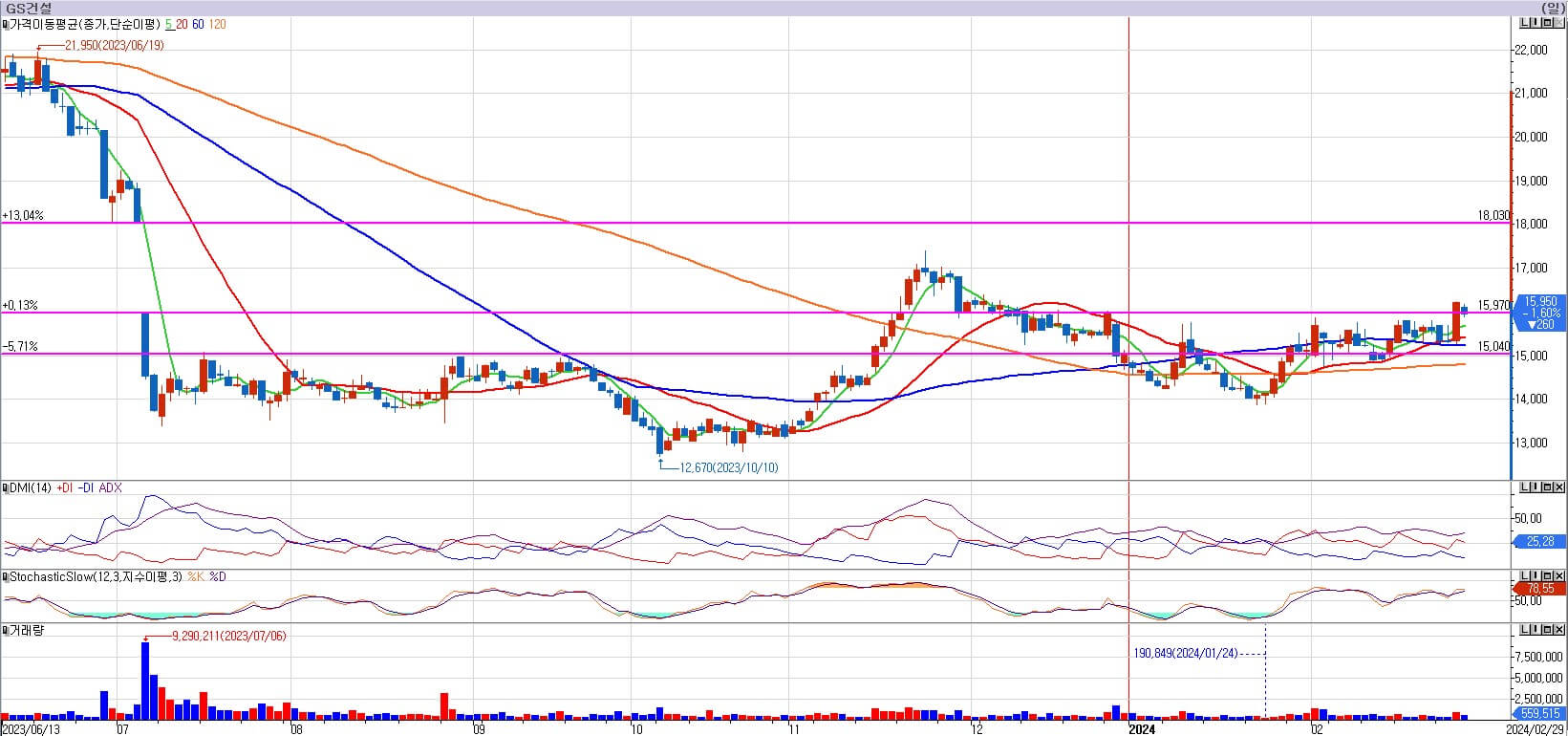 GS건설은 15,970원의 저항을 아직 이겨내지 못했습니다. 15,970원만 이겨낸다면 이평선이 정배열로 돌아서고 상승에 탄력을 받을 것으로 예상됩니다. 그리고 이번에 상승한다면 18,030원까지는 갈 힘을 얻었습니다. 하지만 속도가 빠를 것 같지는 않습니다. 17,000원 부근에도 저항이 존재하기 때문입니다. 다음주 15,970원을 확실히 이겨내는 모습과 거래량을 보고 매수여부를 판단해 보도록 하겠습니다.