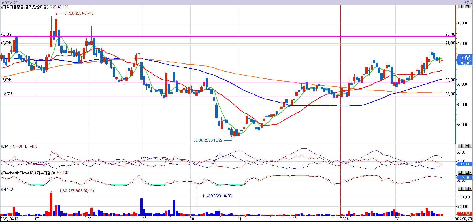 한전기술은 이번주 약간의 조정을 받았습니다. 조정 시 거래량이 줄어드는 모습은 조정이 견조하다는 의미입니다. 원전 관련주를 지금 주시하고 적극적인 매수 전략을 시행할 시기이기 때문에 저는 한전기술이 조정을 조금 더 준다면 매수를 하도록 하겠습니다. 저는 한전기술을 68,600원에 매수하도록 하겠습니다. 그리고 62,000원을 내려올 때까지 보유하도록 하겠습니다. 만약 조정을 더 준다면 65,500원에서는 추가 매수까지 고려하고 있습니다. 일단 1차적으로 다음 주 68,600원 매수여부를 관찰하도록 하겠습니다.