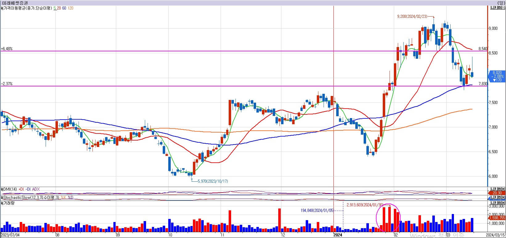 미래에셋증권은 8,540원 아래로 떨어지면 안 된다 했는데, 거래량이 약간 터진 음봉으로 지지력을 뚫었습니다. 8,540원을 뚫으면 안 되는 이유를 지난주 충분히 말씀드렸습니다. 당장 지지력은 7,830원 정도에 있기 때문에 여기서 반등을 해서 되돌리지 못하면 거기까지는 열어놔야 하는 시점입니다. 그래도 다행인 점은 고점에 양봉보다는 음봉이 많다는 점입니다. 저항이 그렇게 크지는 않아서 돌아 세워만 준다면 희망을 가질 수는 있습니다. 다음 주 지켜보겠습니다.