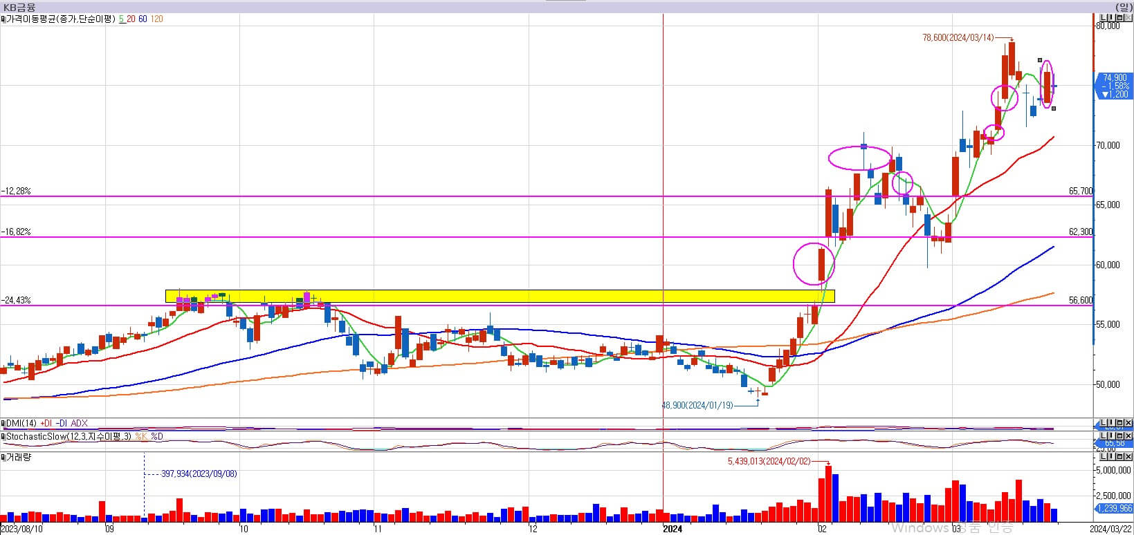 KB금융은 지난주 분석에서 양봉이 너무 많이 나오고 있어, 무너지게 된다면 크게 무너질 수 있다고 했는데, 아직까지는 상승추세가 유지되는 모습을 보이고 있습니다. 이번주 정부의 추가적인 밸류업 정책이 나와주면서 하락을 다시 상승으로 돌린 모습입니다. 3월 21일 양봉이 나왔기 때문에 여기서 다시 흔들리면 이제 불리해지는 모습입니다. 약간의 조정 후 양봉이 나왔다면 그대로 가야 전고점의 저항이 강해지지 않습니다. 다음 주라도 다시 조정을 보인다면 매우 불리해지는 모습이 됩니다. 조정 시 거래량을 보면 지난주 저의 불안한 느낌이 틀릴 수도 있다는 생각도 듭니다. 다음 주 무너지지 않고 이대로 다시 상승을 하는지 지켜보도록 하겠습니다.