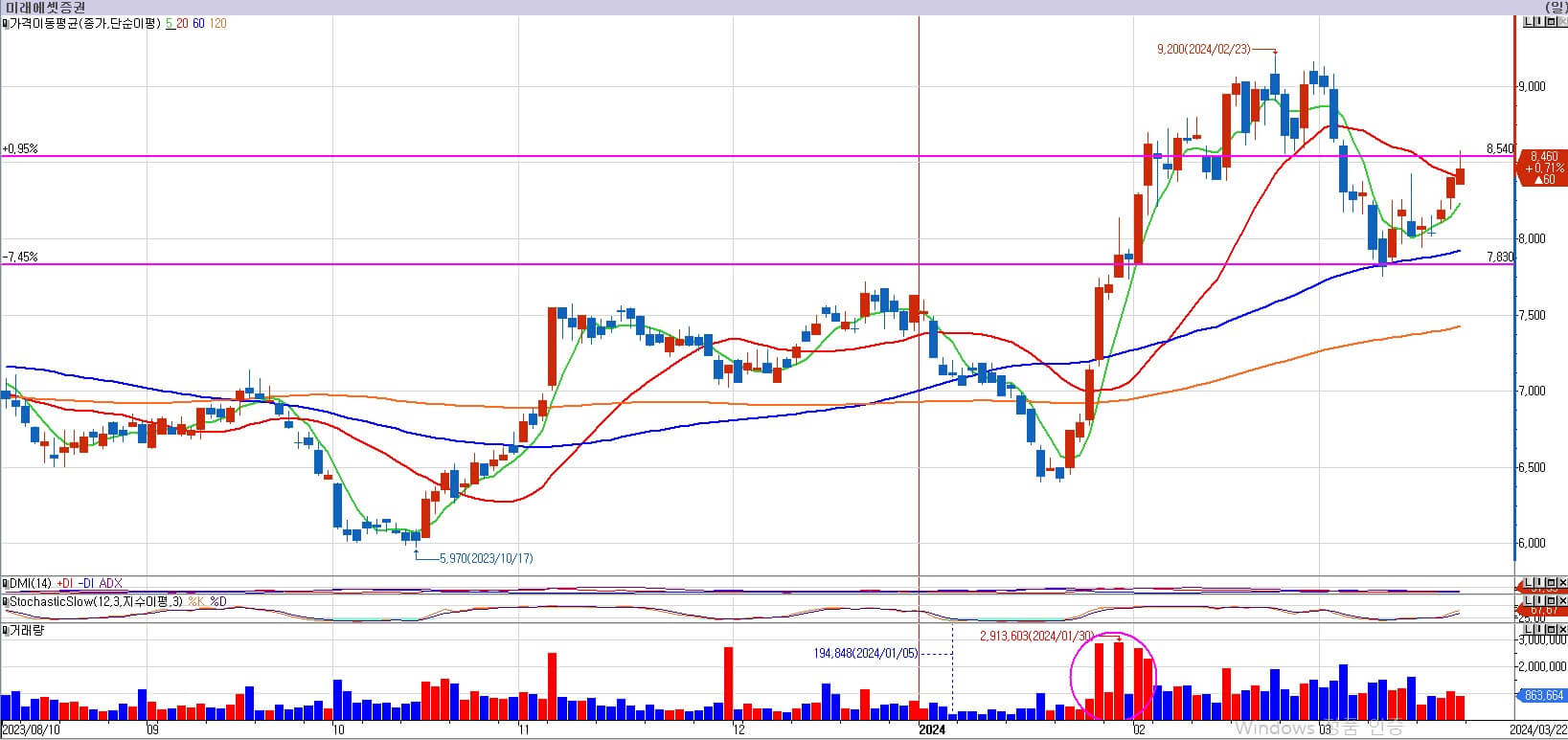 미래에셋증권은 다행히 7,830원을 깨지 않고 반등을 준 모습입니다. 미래에셋증권은 8,540원부터는 저항을 받을 것입니다. 그래서 8,540원 위로 주가가 올라가야만 다시 반등을 제대로 시작한다고 생각합니다. 하지만 하락을 하기 전에 고점에서 횡보를 좀 하다가 조정을 주었기 때문에 8,540원 위로 저항이 만만치 않습니다. 그래서 아무리 밸류업 기대감이라고 해도 한 번에 올라가기는 힘든 차트라 판단합니다. 저항을 맞고 떨어지든, 저항을 돌파하든, 7,830원은 절대로 깨지 않아야 합니다. 일단은 그런 관점으로 지켜보도록 하겠습니다.