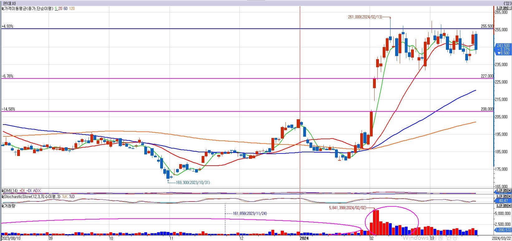 현대차는 255,500원을 넘지 못하면 위험해질 수도 있는 모습이라 했고, 이번주에는 꼭 넘어서야 한다고 했는데, 아쉽게도 이번주도 255,500원을 넘지 못했습니다. 현대차 차트를 보면 약 2달을 같은 자리에서 횡보를 한 것이 됩니다. 횡보는 계속 설명드렸듯이 양날의 검입니다. 오르면 좋지만 떨어지면 매우 위험해집니다. 그 횡보에서 상승으로 전환되었다고 확실히 판단할 수 있는 지점이 255,500원을 뚫고 가는 것인데, 쉽지 않습니다. 현대차는 여기서 무너지지 않고, 횡보를 계속하는 것이 차선책이고, 무너지면 위험해집니다. 관망하도록 하겠습니다.
