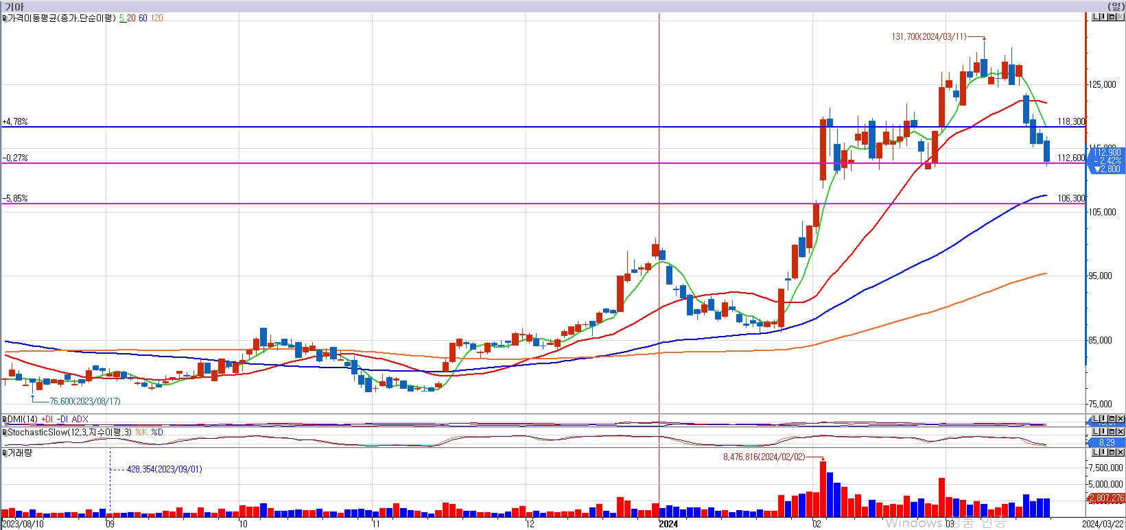 기아는 이번주 112,600원 지지점까지 조정을 주었습니다. 112,600원은 강력한 지지점이므로 충분히 지지는 받을 것으로 생각합니다. 원래는 112,600원에 매수를 해봄직 하나, 4일간의 음봉으로 조정을 받을 때 거래량이 좀 터진 것이 마음에 들지 않습니다. 조정 시 음봉에 거래량이 좀 발생할 수 있지만, 이렇게 4일 연속 발생한다는 것은 큰손들의 매도 가능성도 배제할 수 없기 때문입니다. 그래서 저는 기아차를 매수하지 않겠습니다. 분명한 것은 112,600원은 중요한 지지점이고, 106,300원에도 중요한 갭 지지가 있습니다. 기아차는 이후 모습을 추가적으로 관찰한 후 저의 의구심이 지워질 때 매수해 보도록 하겠습니다. 아직은 기다리겠습니다.