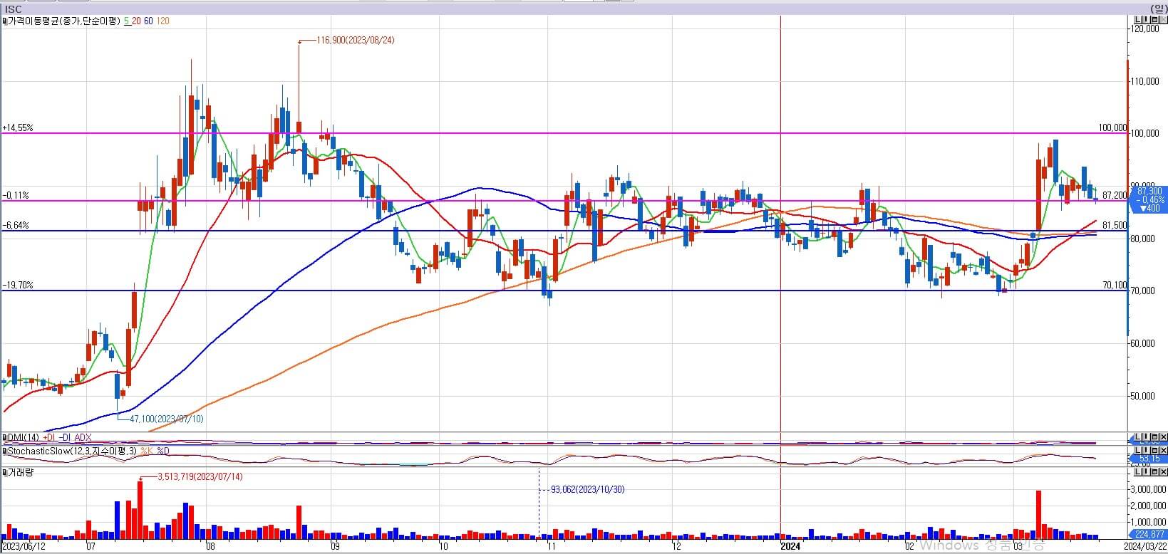 ISC는 100,000원 저항을 바로 도전하지 않고 이번주 같은 자리에서 횡보만 하며 에너지를 모았습니다. 이제 20일 이평선이 완전히 정배열로 전환되었습니다. 차트적으로 판단하면 이평선을 기다리면서 다시 한번 상승할 힘을 모으고 있는 모습이라 판단합니다. 그래서 전략은 같습니다. 81,500원을 이탈하지 않는다면 매수한 물량은 계속 보유하도록 하겠습니다. 다음 주도 오히려 더 횡보를 할 수 있고, 조정도 보일 수 있습니다. 하지만 ISC에 대해 긍정적인 전망은 계속 유지하도록 하겠습니다.