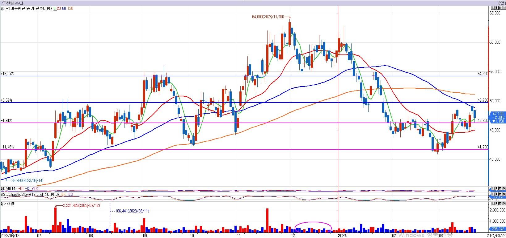두산테스나는 이번주 상승을 주었습니다. 첫 번째 저항인 46,800원 위로 올랐기 때문에 이제 46,800원의 저항은 사라졌고 49,700원과 54,200원의 저항만 남았습니다. 지지는 44,600원과 41,700원의 지지가 있습니다. 이번 상승으로 지지도 2개나 생겼기 때문에 차트의 하락추세를 조금은 되돌릴 힘은 얻었습니다. 하지만 49,700원의 저항과 이평선의 저항들은 여전히 부담으로 작용을 하기 때문에 지지와 저항이 첨예하게 대립을 하는 모습이라고 볼 수 있습니다. 아직은 매수할 타이밍이 아니라고 판단되며 지지와 저항 중 어느 하나를 확실히 이기는 모습을 보고 판단을 하도록 하겠습니다.