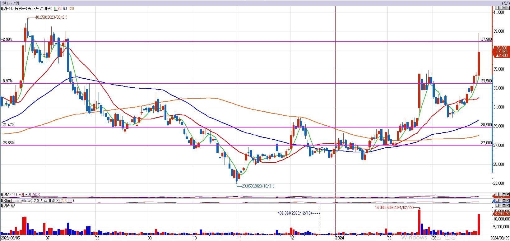 현대로템은 33,500의 저항에 도전을 하러 갈 것이고, 그 모습을 본다고 했었는데 시원하게 뚫고 날아갔습니다. 저항을 뚫는데 거래량조차 터지지 않는 것을 보니, 세력이 붙은 종목이라는 게 확연히 느껴집니다. 동의하시나요? 현대로템은 37,900원에 저항이 있습니다. 거기 저항도 만만치 않아 한번에 못 뚫는다고 생각해서, 이번에 조정을 준다면 매수를 해보도록 하겠습니다. 현대로템은 34,150원에 매수를 해보도록 하겠습니다. 다음 주 매수가 되길 바라보겠습니다.