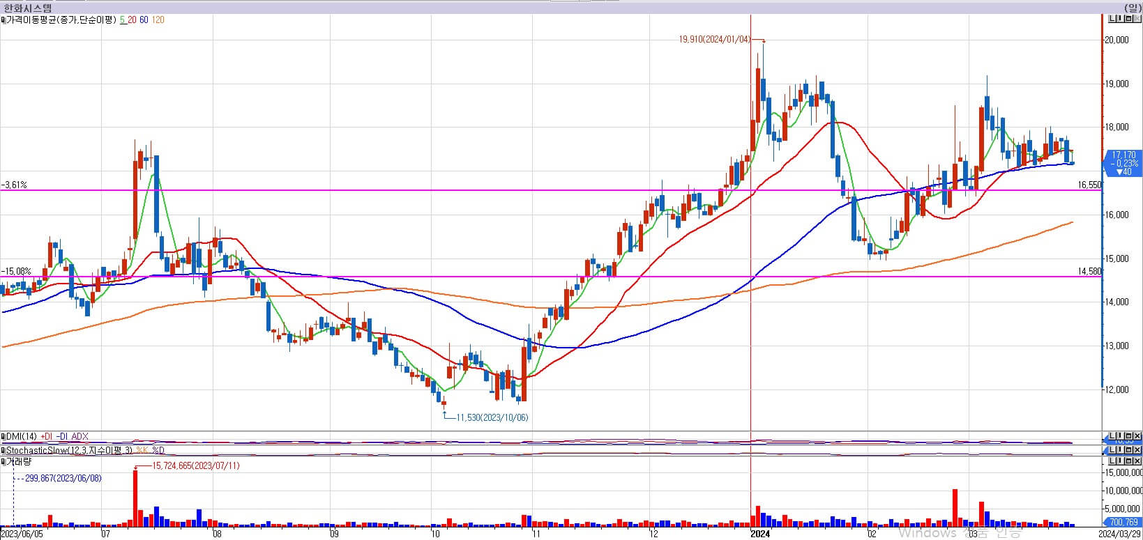 한화시스템은 갈듯한 모습을 보이다가도 음봉이 나오며 주저앉는 모습을 반복하고 있습니다. 하지만 거래량이 적기 때문에 이런 모습도 그렇게 위험하게 바라보고는 있지 않습니다. 원래 전략대로 16,550원 아래로 내려오지 않는다면 계속 보유하도록 하겠습니다. 언제 갈지는 모르지만, 가기 시작한다면 크게 갈 수 있는 모습이라 개인적으로 생각합니다. 기대하겠습니다.