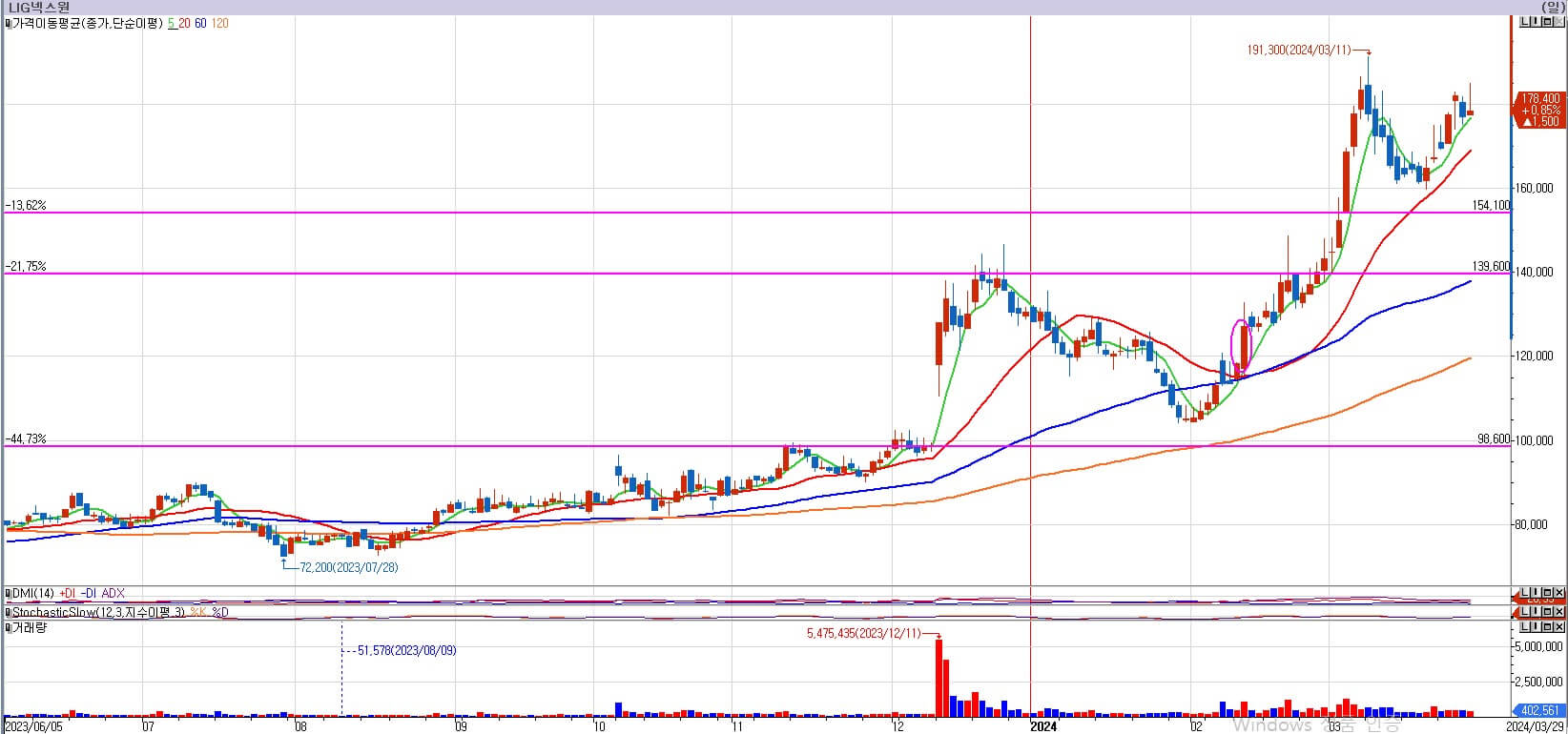 한화에어로스페이스는 오늘 전고점을 넘는 윗꼬리를 보여주었습니다. 다행히 20일 이평선에서 머물거나 하지 않고 곧바로 갭상승을 주었고, 20일선에서의 거래량으로 보아 아직 상승의 여력이 남아있는 모습이었습니다. 한화에어로스페이스는 189,200원부터는 갭 지지가 시작되며, 이평선 역시 모두 지지 역할을 하기 때문에 아직은 문제 될 것이 없어 보입니다. 오늘 윗꼬리가 아닌 전고점을 확실히 넘는 양봉이었으면 마음이 편했을 것이나, 다음 주 시가가 낮으면 차트 그림이 애매해지게 됩니다. 다음 주 시가가 높은 것이 무엇보다 중요하다고 생각합니다. 지켜보도록 하겠습니다.