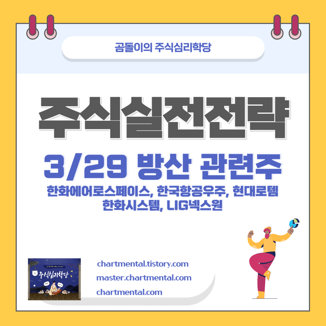 오늘은 3/29 기준 방산주 관련주 5 종목에 대해 지난 한 주간의 변화와 주가 전망을 해보도록 하겠습니다. 방산주가 강세를 이어가는 모습입니다. 그럼 시작해 보겠습니다.