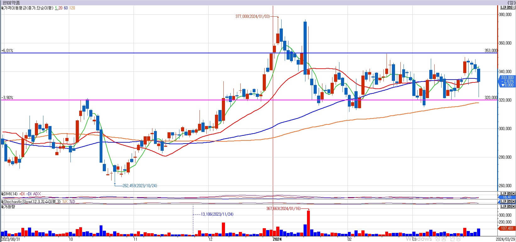 한미약품의 경우 지난주 음봉으로 다시 추세가 애매해졌기 때문에, 그나마 옆으로 횡보를 하는 것이 낫다고 했는데, 이번에 다시 작은 반등을 주었습니다. 결국은 차트적으로 박스권을 그리며 횡보를 하는 모습을 보여주고 있습니다. 전체적인 이평선은 정배열을 유지하고 있지만, 이런 횡보를 할 때 어느 방향으로 튈지 모른다는 것이 문제입니다. 즉 확실한 방향성이 나올 때까지는 관망하는 것이 맞으며, 기다리도록 하겠습니다. 거래량으로나 봉의 힘으로 보나 아직은 분석이 어려우며, 확실한 방향성이 곧 나오길 바라겠습니다.