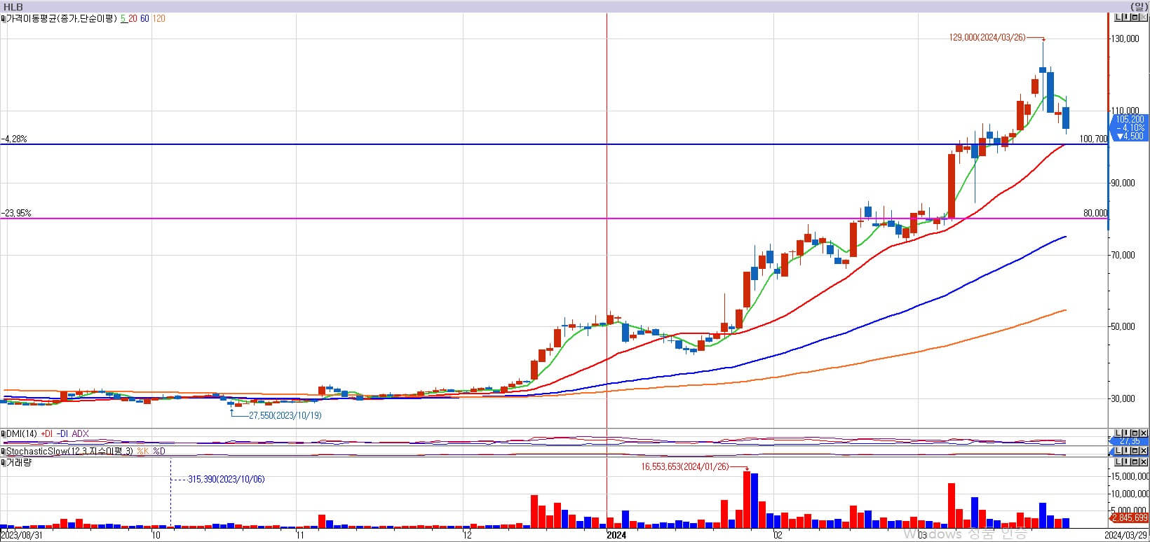 HLB는 이번주도 상승하는 모습을 보여주고 있습니다. 아직까지 상승 중 거래량으로 보면 특별히 문제가 되거나 위험한 모습은 보이지 않습니다. 하지만 3월 21일 양봉 이후 22일처럼 시가가 낮게 출발하는 모습이 자주 나와서는 안됩니다. 시가마다 누군가의 매도가 강하게 나온다는 것이고, 그런 모습이 반복되는 것은 위험해질 수도 있는 모습입니다. HLB는 100,700원의 지지와 80,000원의 지지가 강합니다. 지금부터라도 거래량이 터진 양봉이 계속 나오면 안 되기 때문에, 그 부분을 관찰해 보도록 하겠습니다.