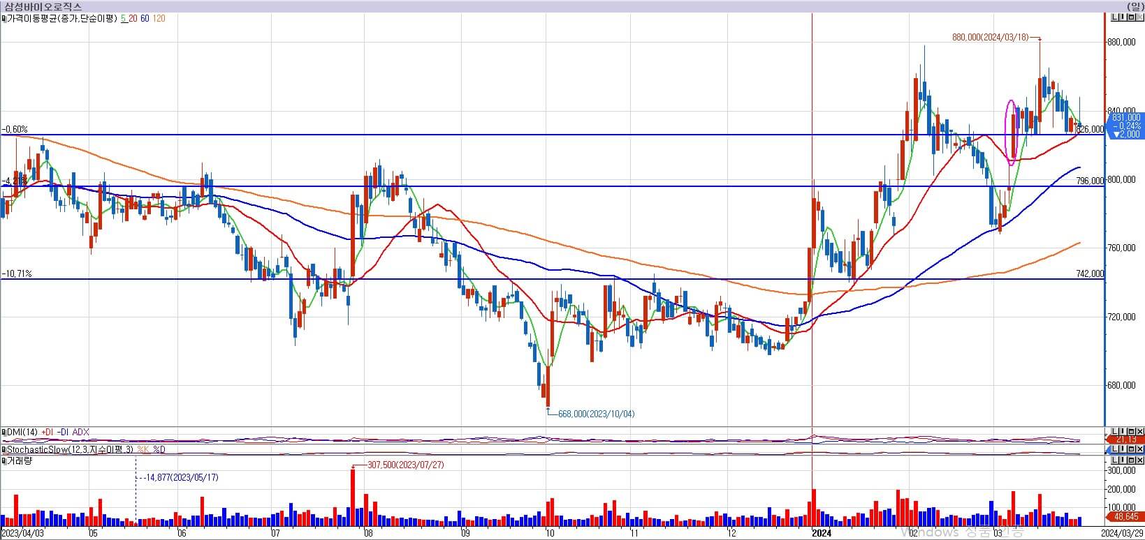 삼성바이오로직스를 796,000원 부근까지 조정을 주면 매수를 한다 했는데, 첫 번째 지지점인 826,000원에서 지지를 받는 모습을 보여주고 있습니다. 90만 원 저항을 앞두고 이런 모습을 보이는 것은 전혀 문제가 되지 않습니다. 이제 796,000원의 매수 전략은 일단은 폐기하도록 하겠습니다. 전략을 수정해서 다음 주 826,000원에서 삼성바이오로직스를 매수하도록 하겠습니다. 그리고 796,000원 아래로 내려온다면 매도하도록 하겠습니다. 매수전략이 성공하길 빌겠습니다.
