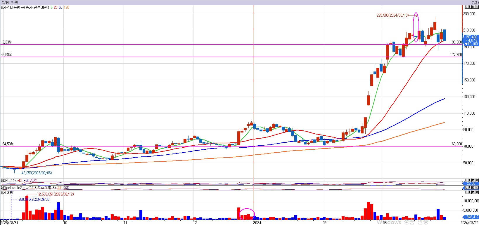 알테오젠은 3월 18일 고점 10%를 갔다 오는 봉을 만들었습니다. 이런 봉을 우리는 도지라고 합니다. 이런 도지가 고점에서 나오면 생각을 해봐야 합니다. 왜 나왔을까? 과연 세력이 저 도지에서 물량을 털기 위해 고의로 만들었을까? 고점에서는 개인들이 좋아하는 모습이 나오면 위험해집니다. 하지만 저런 윗꼬리 도지는 개인들이 싫어하는 모습이므로, 저는 개인적으로 그렇게 위험한 모습은 아니라고 판단은 합니다. 하지만 저런 윗꼬리 도지가 많이 나오는 것도 좋지 않습니다. 저는 203,000원 위로 주가가 올라가기만 해도 아무런 문제가 없다고 판단하고 있습니다. 전략은 동일합니다. 177,800원을 이탈하지 않는다면 계속 보유하도록 하겠습니다.