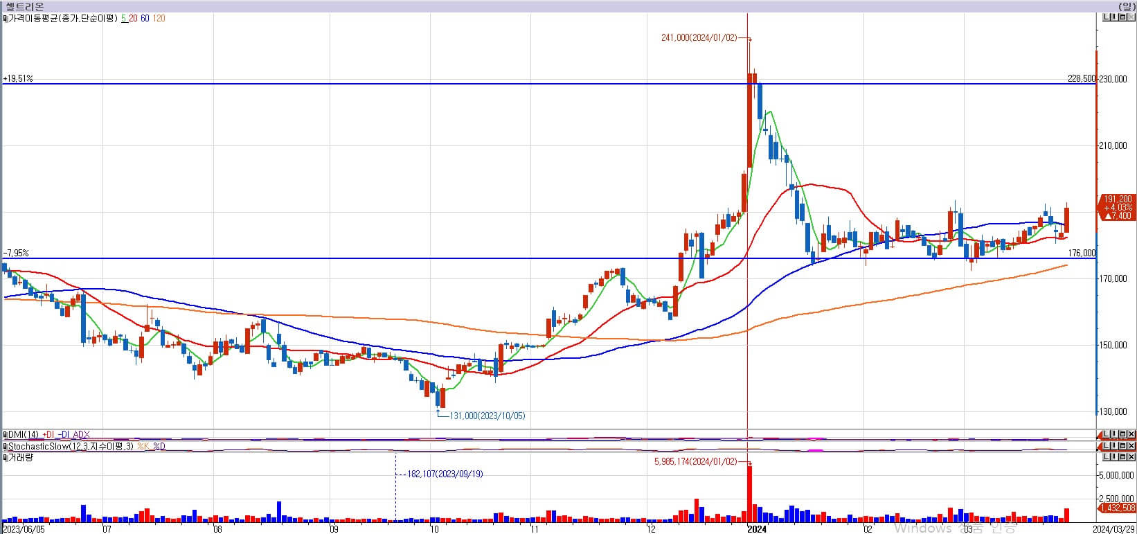 셀트리온은 3월 29일 +4.03%의 양봉이 나오면서 다시 상승에 대한 의지를 보여주고 있습니다. 거래량도 좀 터진 양봉이 나왔습니다. 횡보를 오랜 기간 했기 때문에 상승으로 방향을 잡으면 크게 갈 수 있습니다. 이제는 출발을 하려나요? 저는 다음 주 월요일 셀트리온이 강하다면 따라붙는 전략을 취해보도록 하겠습니다. 다만 198,000원부터는 또다시 저항이 시작됩니다. 거기에서는 일부 물량을 매도하여 수익실현 하도록 하겠습니다. 다음 주를 기대하겠습니다.