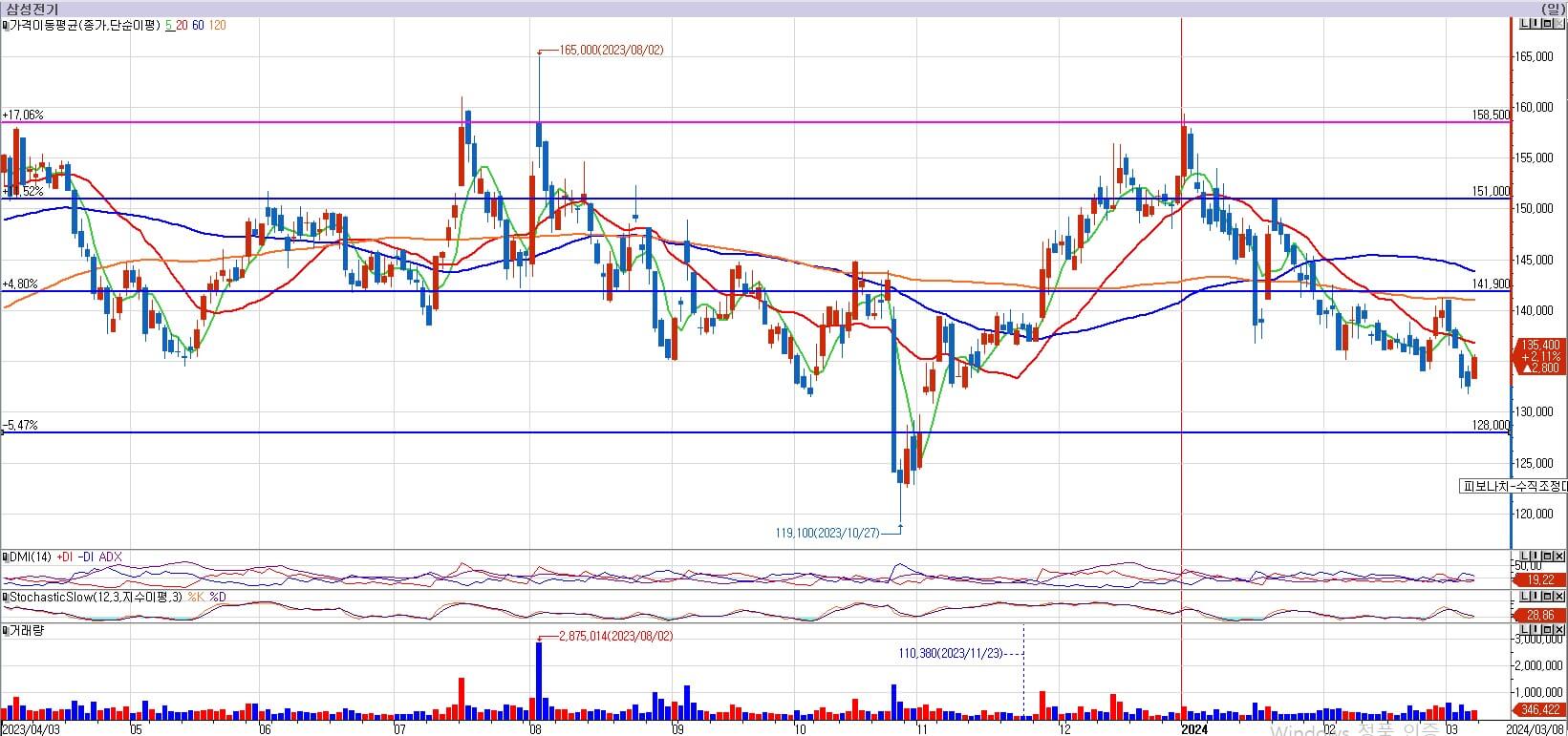 삼성전기는 코스피, 코스닥이 오르는 동안에도 철저히 소외가 되고 있는 모습입니다. 141,900원의 저항을 이겨내지도 못한 모습이며, 이평선 마저 계속 저항으로 작용을 하여 내리누르고 있습니다. 갭지지가 있는 128,000원까지는 계속 열어놔야 하는 모습입니다.