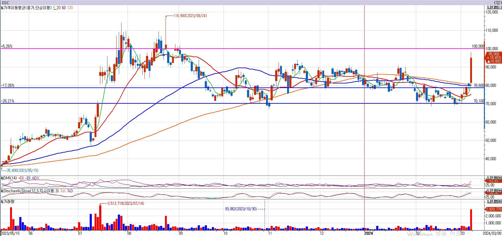 ISC는 오늘 +18.4%의 엄청난 상승을 주었습니다. 그동안의 모든 어려움을 한 번에 극복하려 하는 시원한 양봉이었습니다. 하지만 이제 중요한 저항인 100,000원을 앞두고 있습니다. 100,000원 저항은 두고두고 말씀드려 왔습니다. ISC는 저 100,000원을 넘으면 새로운 그림이 됩니다. 아직은 저항을 뚫지 못했습니다. 다음 주 바로 10만 원을 도전할지 아니면 조정을 줬다가 갈지 알 수 없으나, 오늘의 양봉 의지가 대단하기 때문에, ISC를 다음주 매수해 보겠습니다. 저는 ISC를 다음 주 87,200원에 매수하도록 하겠습니다. 만약 안주면 매수하지 않겠습니다. 다음 주를 기대해 보겠습니다.