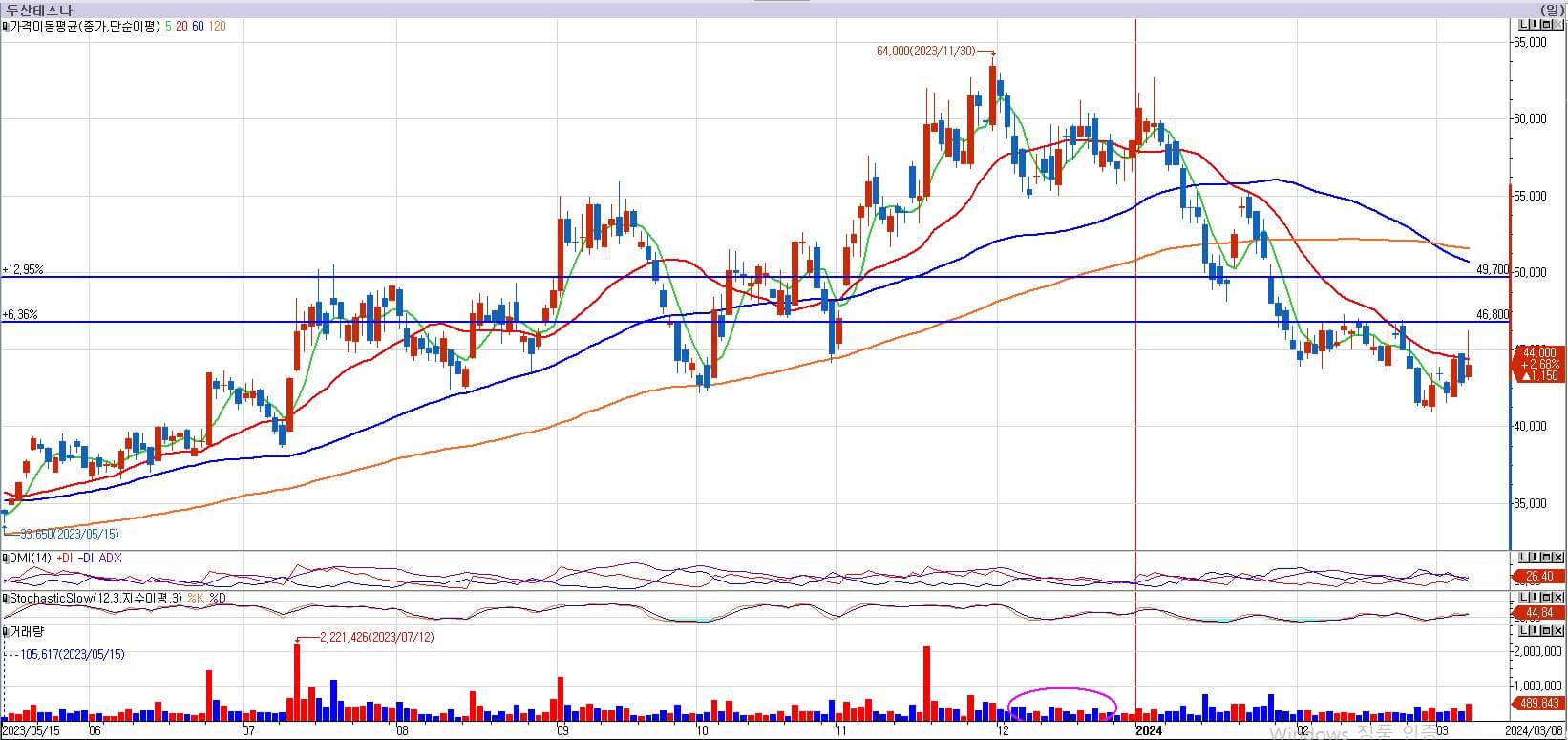 두산테스나 역시 메모리 반도체 업황 반등과 함께 바닥에서 반등을 주고 있는 모습입니다. 두산테스나는 이제 다시 상승을 준비하는 모습입니다. 그럼 이제 위의 저항이 중요해집니다. 두산테스나의 저항은 46,800원과 49,700원에 있습니다. 그리고 54,200원에도 저항이 있고, 이평선들도 모두 저항입니다. 업황이 돌아서고 있고, 두산테스나의 사업 영역이 좋다고 해도 저항이 이렇게 많으면 저는 매수하지 않습니다. 최소한 저항 몇개는 이겨내는 모습을 보고, 의지를 본 뒤에 매수를 합니다. 다음주도 관망하도록 하겠습니다.